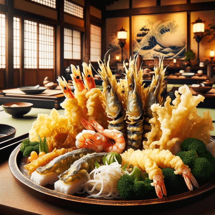 튀김 세트 : 바삭하고 가벼운 반죽으로 튀긴 다양한 해산물과 야채. 각 조각은 재료의 자연스러운 맛을 강조하는 데 완벽하게 튀겨집니다.