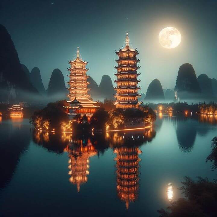 - 겨울에는 계림 시내의 쌍봉선월이 조명으로 아름답게 빛납니다. 밤에 방문하면 도시의 야경과 함께 두 봉우리의 장관을 감상할 수 있습니다.